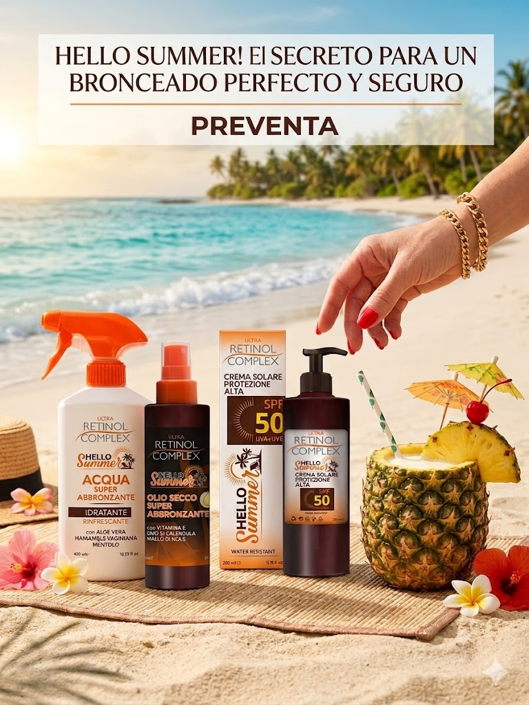 Este pack de la línea Ultra Retinol Complex «Hello Summer» es muy completo porque cubre las tres necesidades principales del verano: protección, color y frescor.